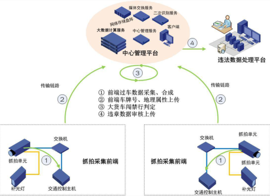 改變以往大量交警人工查控模式,通過道路車輛智能監(jiān)測記錄系統(tǒng)及智能視頻分析處理技術,后端平臺可以對進入視頻檢測區(qū)域的車輛進行抓拍、車輛識別、報警、記錄保存車輛通行的信息,篩選出違反限行的車輛并將限行違法數據上傳至交警違法處理平臺。