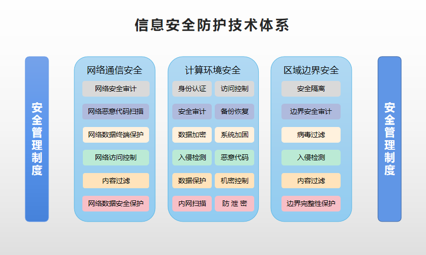 信息系統(tǒng)安全建設(shè)內(nèi)容: 信息系統(tǒng)的安全建設(shè)包括三方面:一是技術(shù)安全體系建設(shè);二是管理安全體系建設(shè);三是運(yùn)行保障安全體系建設(shè)。其中,技術(shù)安全體系設(shè)計(jì)和建設(shè)是關(guān)鍵和重點(diǎn)。信息安全防護(hù)技術(shù)整體解決方案: